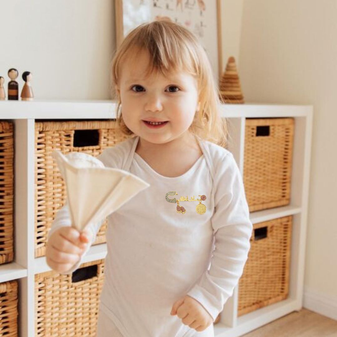 This Masha Allah Baby Pin features elegant Arabic script in a golden finish, including the powerful verses of Ayat ul Kursi and the 4 QUL. Display your faith and protect your little one with this beautiful and functional accessory. Made with expert craftsmanship and attention to detail.
