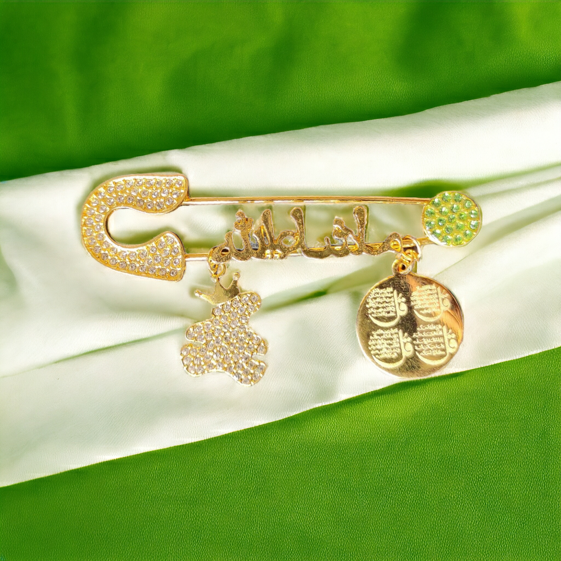 Masha Allah Baby Pin With T and ( Arabic ) Golden and ( Green Color )( 4 QUL )
